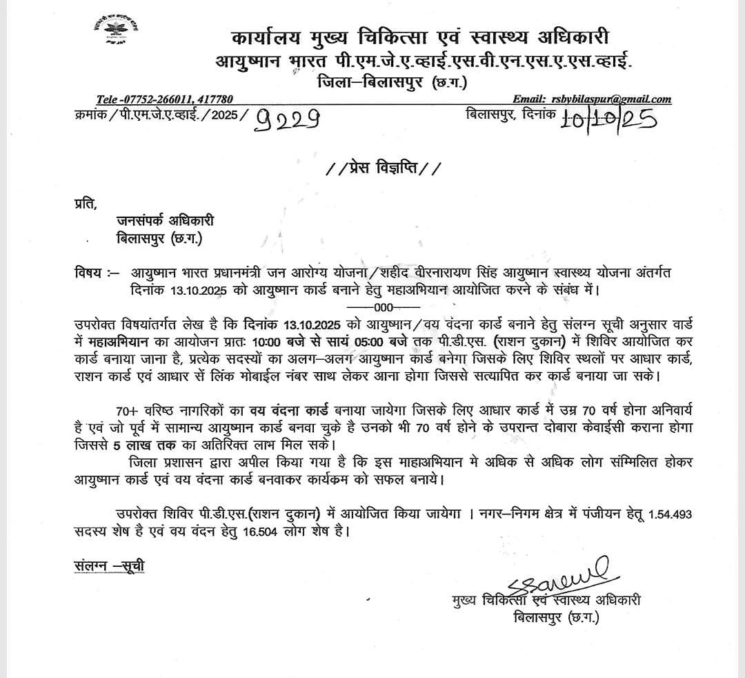 बिलासपुर – आयुष्मान कार्ड बनाने 13 अक्टूबर (सोमवार) को एक दिवसीय विशेष महाअभियान आयोजित किया जा रहा है। इस दौरान नगर निगम क्षेत्र के विभिन्न वार्डों में स्थित राशन दुकानों में सवेरे 10 बजे से शाम 5 बजे तक शिविरों का आयोजन किया जाएगा, जिसमें पात्र हितग्राहियों के आयुष्मान कार्ड एवं 70 वर्ष से अधिक आयु के नागरिकों के वय वंदन कार्ड भी बनाए जाएंगे। बताया जा रहा है। कि प्रत्येक पात्र व्यक्ति का अलग-अलग कार्ड बनाया जाएगा। जिला प्रशासन ने नागरिकों से अपील की है कि वे सभी आवश्यक दस्तावेजों के साथ शिविर स्थल पर उपस्थित होकर योजना का लाभ लें। आपको बता दे कि योजना के विशेष प्रावधानों के अंतर्गत 70 वर्ष या उससे अधिक आयु वाले नागरिकों के लिए वय वंदन कार्ड बनाया जाएगा।