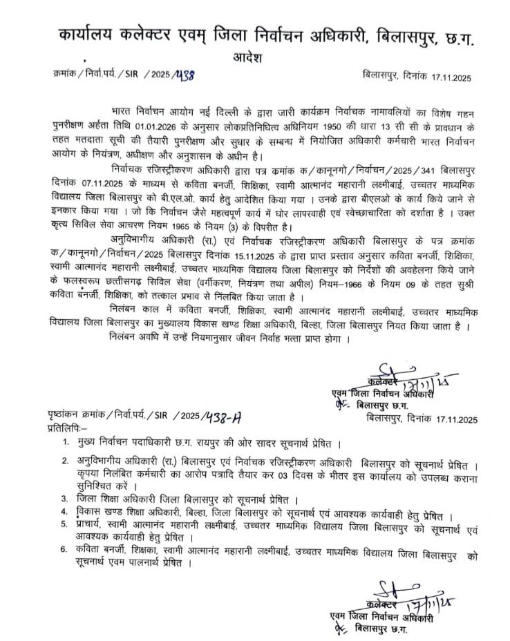 भारत निर्वाचन आयोग नई दिल्ली के द्वारा निर्वाचक नामावली का गहन पुनरीक्षण कार्य के तहत मतदाता सूची की तैयारी, पुनरीक्षण और सुधार के संबंध में नियोजित अधिकारी कर्मचारी के द्वारा नियोजित अधिकारियों को भारत निर्वाचन आयोग के नियंत्रण,अधीक्षण और अनुशासन के अधीन कर दिया है। निर्वाचक रजिस्ट्रीकरण अधिकारी बिलासपुर द्वारा सात नवंबर को आदेश जारी कर कविता बनर्जी शिक्षिका स्वामी आत्मानंद महारानी लक्ष्मीबाई उच्चतर माध्यमिक विद्यालय जिला बिलासपुर को बीएलओ कार्य हेतु आदेशित किया गया था। पर उनके द्वारा बीएलओ कार्य किए जाने से इंकार कर दिया गया। जो कि निर्वाचन जैसे महत्वपूर्ण कार्य में घोर लापरवाही और स्वेच्छाचारिता प्रदर्शित करता है।