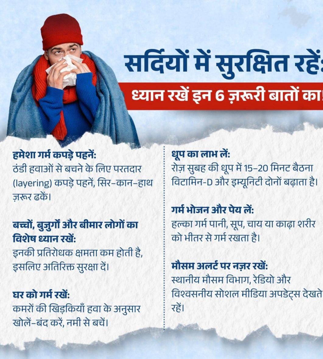 एडवाइजरी में अनावश्यक बाहर निकलने से बचने, गर्म कपड़ों का नियमित उपयोग करने, सिर, कान, हाथ और पैर को ढंककर रखने, तथा गर्म तरल पदार्थ लेते रहने की सलाह दी गई है। अत्यधिक कंपकंपी, उंगलियों का सफेद पड़ना, सुन्नता, बोलने या सांस लेने में कठिनाई जैसे लक्षण दिखें तो तुरंत डॉक्टर से संपर्क करने की हिदायत दी गई है, क्योंकि ये हाइपोथर्मिया और फ्रॉस्टबाइट के संकेत हो सकते हैं। प्राधिकरण ने आग जलाते समय कमरों को हवादार रखने पर जोर दिया है, क्योंकि बंद कमरों में कोयला जलाने से घातक गैसें जमा हो सकती हैं। साथ ही किसी भी स्वास्थ्य समस्या पर तुरंत नज़दीकी स्वास्थ्य केंद्र पहुंचने और बच्चों व बुजुर्गों की विशेष देखभाल करने की अपील की गई है।