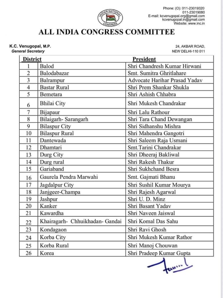 बालोद में चंद्रेश कुमार हिरवानी, बलौदाबाजार में सुमित्रा घृतलहरे, बलरामपुर में हरिहर प्रसाद यादव और बस्तर ग्रामीण के लिए प्रेम शंकर शुक्ला को जिलाध्यक्ष नियुक्त किया गया है। दंतेवाड़ा में सलीम राजा उस्मान, धमतरी में तारिणी चंद्राकर, दुर्ग शहर में धीरज बाकलीवाल, कोंडागांव में रवि घोष और कोरबा शहर में मुकेश कुमार राठौर को जिम्मेदारी मिली है।