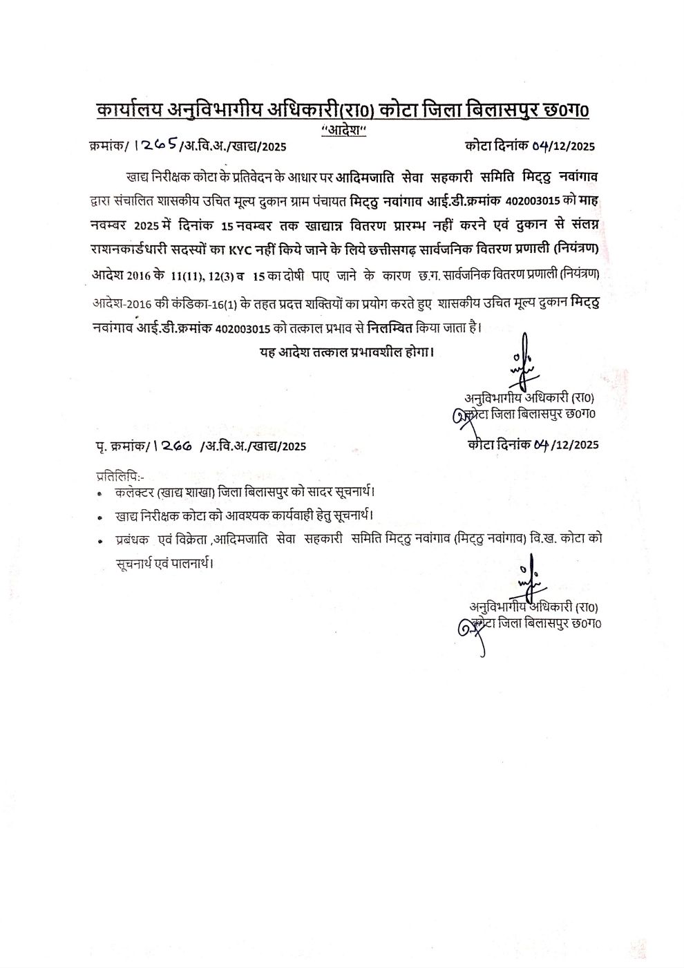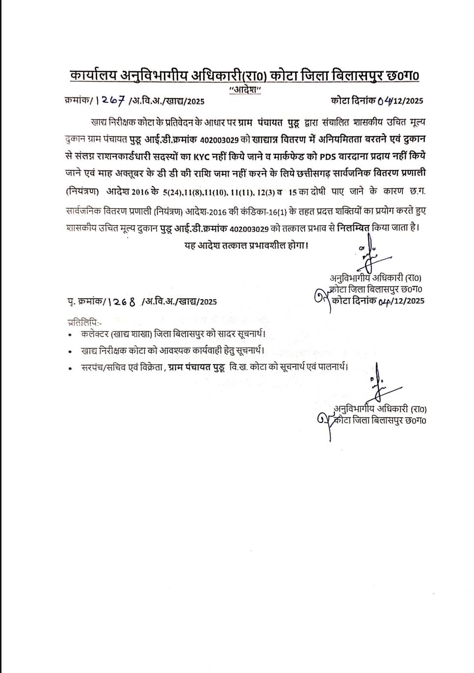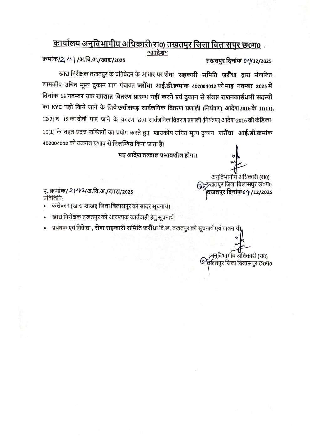 कोटा और तखतपुर क्षेत्र की तीन उचित मूल्य दुकानें निलंबित….एसडीएम ने की कार्रवाई, अनियमितता की मिली थी शिकायत