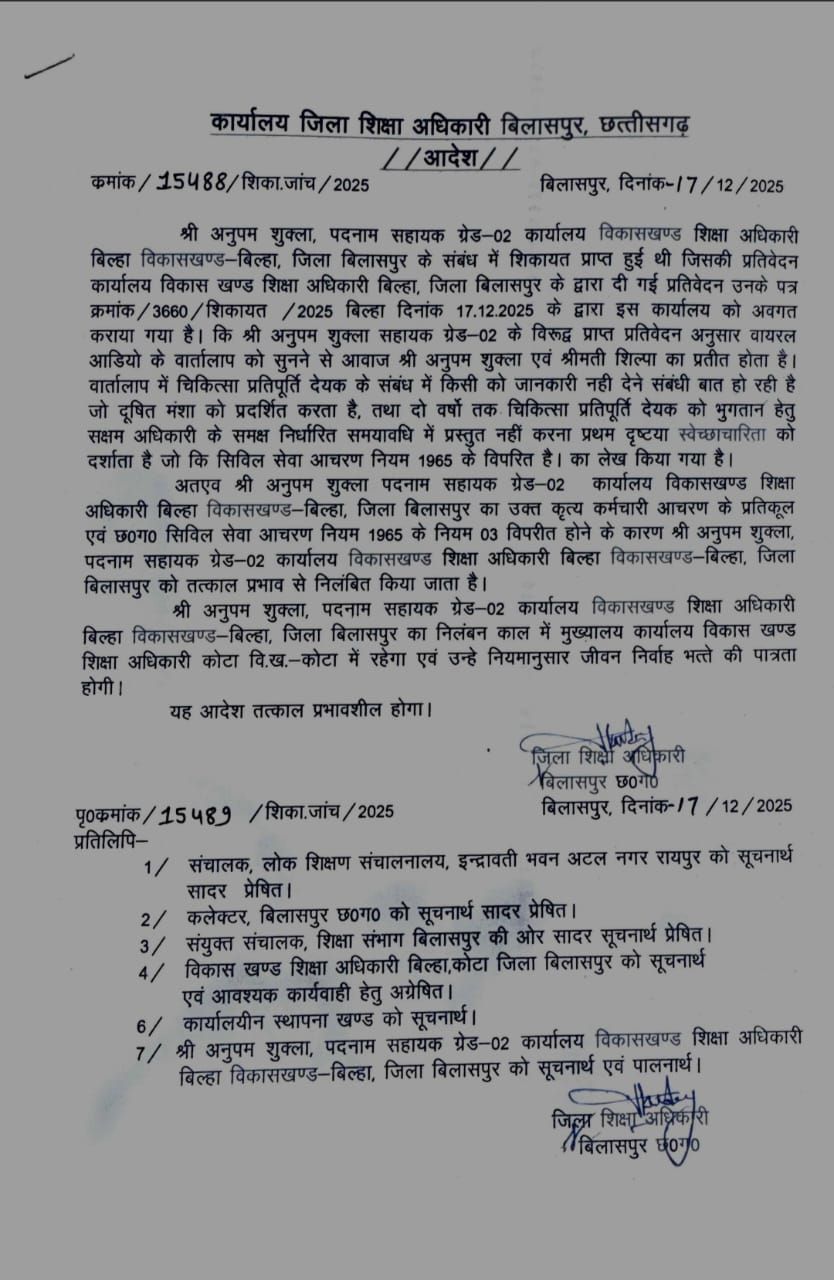 बिलासपुर – जिला शिक्षा अधिकारी बिलासपुर द्वारा एक महत्वपूर्ण कार्रवाई करते हुए विकासखंड शिक्षा अधिकारी कार्यालय बिल्हा में पदस्थ सहायक ग्रेड-02 अनूपम शुक्ला को तत्काल प्रभाव से निलंबित कर दिया गया है। यह कार्रवाई उनके विरुद्ध प्राप्त शिकायत और जांच प्रतिवेदन के आधार पर की गई है। मिली जानकारी के अनुसार, अनूपम शुक्ला के खिलाफ एक वायरल ऑडियो को लेकर शिकायत दर्ज कराई गई थी। इस शिकायत की जांच विकासखंड शिक्षा अधिकारी बिल्हा द्वारा की गई, जिसकी रिपोर्ट 17 दिसंबर 2025 को जिला शिक्षा अधिकारी कार्यालय को प्रस्तुत की गई। जांच में सामने आया कि वायरल ऑडियो में अनूपम शुक्ला और एक महिला के बीच बातचीत प्रतीत होती है, जिसमें चिकित्सा प्रतिपूर्ति देयक से संबंधित जानकारी देने से इनकार किए जाने की बात कही गई है। यह आचरण शासकीय सेवा नियमों के विपरीत पाया गया।