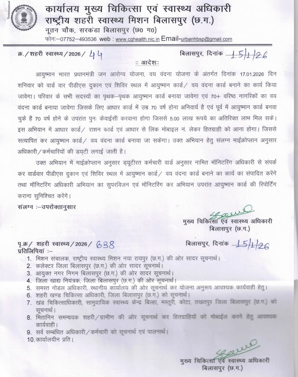 बिलासपुर – राष्ट्रीय शहरी स्वास्थ्य मिशन बिलासपुर के अंतर्गत आयुष्मान भारत प्रधानमंत्री जन आरोग्य योजना एवं वय वंदना योजना के तहत पात्र हितग्राहियों के लिए विशेष अभियान आयोजित किया जा रहा है। मुख्य चिकित्सा एवं स्वास्थ्य अधिकारी, बिलासपुर द्वारा जारी आदेश के अनुसार यह अभियान 17 जनवरी 2026, शनिवार को वार्डवार पीडीएस दुकानों एवं निर्धारित शिविर स्थलों में संचालित किया जाएगा। अभियान के तहत परिवार के सभी पात्र सदस्यों का पृथक-पृथक आयुष्मान कार्ड बनाया जाएगा। वहीं 70 वर्ष या उससे अधिक आयु के वरिष्ठ नागरिकों का वय वंदना कार्ड तैयार किया जाएगा। वय वंदना कार्ड बनवाने के लिए आधार कार्ड में आयु 70 वर्ष या उससे अधिक होना अनिवार्य है। जिन वरिष्ठ नागरिकों का पूर्व में आयुष्मान कार्ड बन चुका है, उन्हें 70 वर्ष पूर्ण होने के उपरांत पुनः ई-केवाईसी कराना होगा, जिससे उन्हें 5 लाख रुपये तक के अतिरिक्त स्वास्थ्य लाभ की पात्रता मिल सकेगी। अभियान में हितग्राहियों को आधार कार्ड, राशन कार्ड तथा आधार से लिंक मोबाइल नंबर के साथ उपस्थित होना आवश्यक होगा,