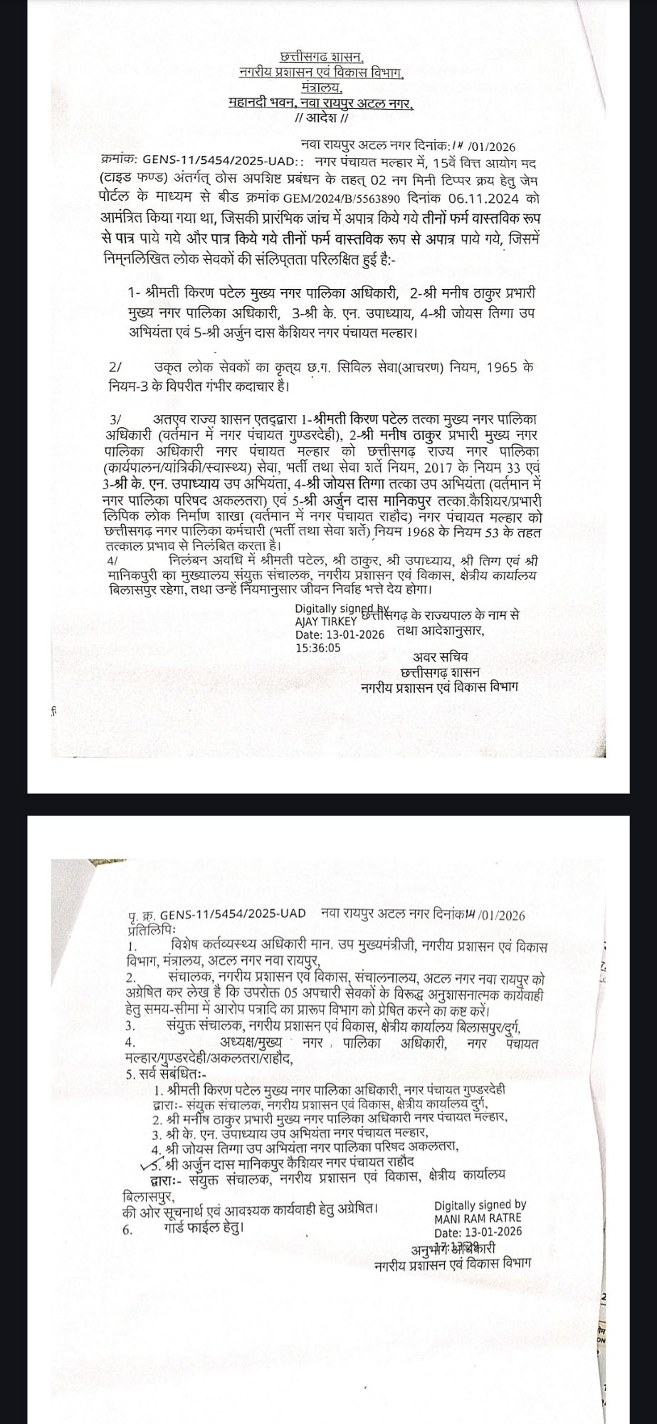 रायपुर – छत्तीसगढ़ शासन के नगरीय प्रशासन एवं विकास विभाग ने नगर पंचायत मल्हार में वित्तीय अनियमितताओं के गंभीर मामले में कड़ी कार्रवाई करते हुए पांच लोक सेवकों को निलंबित कर दिया है। यह आदेश मंत्रालय से जारी किया गया है, जिसमें 15वें वित्त आयोग मद (टाइड फण्ड) के अंतर्गत ठोस अपशिष्ट प्रबंधन हेतु दो मिनी टिप्पर क्रय प्रक्रिया में हुई गड़बड़ियों को आधार बनाया गया है। मिली जानकारी के अनुसार नगर पंचायत मल्हार द्वारा जेम पोर्टल के माध्यम से मिनी टिप्पर क्रय हेतु बीड क्रमांक GEM/2024/B/5563890 दिनांक 06.11.2024 को आमंत्रित की गई थी। प्रारंभिक जांच में पाया गया कि पात्र फर्मों को अपात्र और अपात्र फर्मों को पात्र घोषित कर दिया गया, जिससे शासकीय प्रक्रिया में गंभीर अनियमितता सामने आई। इस प्रकरण में पांच अधिकारियों और कर्मचारियों की संलिप्तता उजागर हुई। शासन ने इस मामले में तत्काल प्रभाव से किरण पटेल (तत्कालीन मुख्य नगर पंचायत अधिकारी), मनीष ठाकुर (प्रभारी मुख्य नगर पालिका अधिकारी), के.एन. उपाध्याय (उप अभियंता), जोयस तिग्गा (उप अभियंता) तथा अर्जुन दास (कैशियर) को निलंबित कर दिया है। इनके कृत्य को छत्तीसगढ़ सिविल सेवा (आचरण) नियम 1965 के नियम-3 का उल्लंघन मानते हुए इसे गंभीर कदाचार की श्रेणी में रखा गया है।