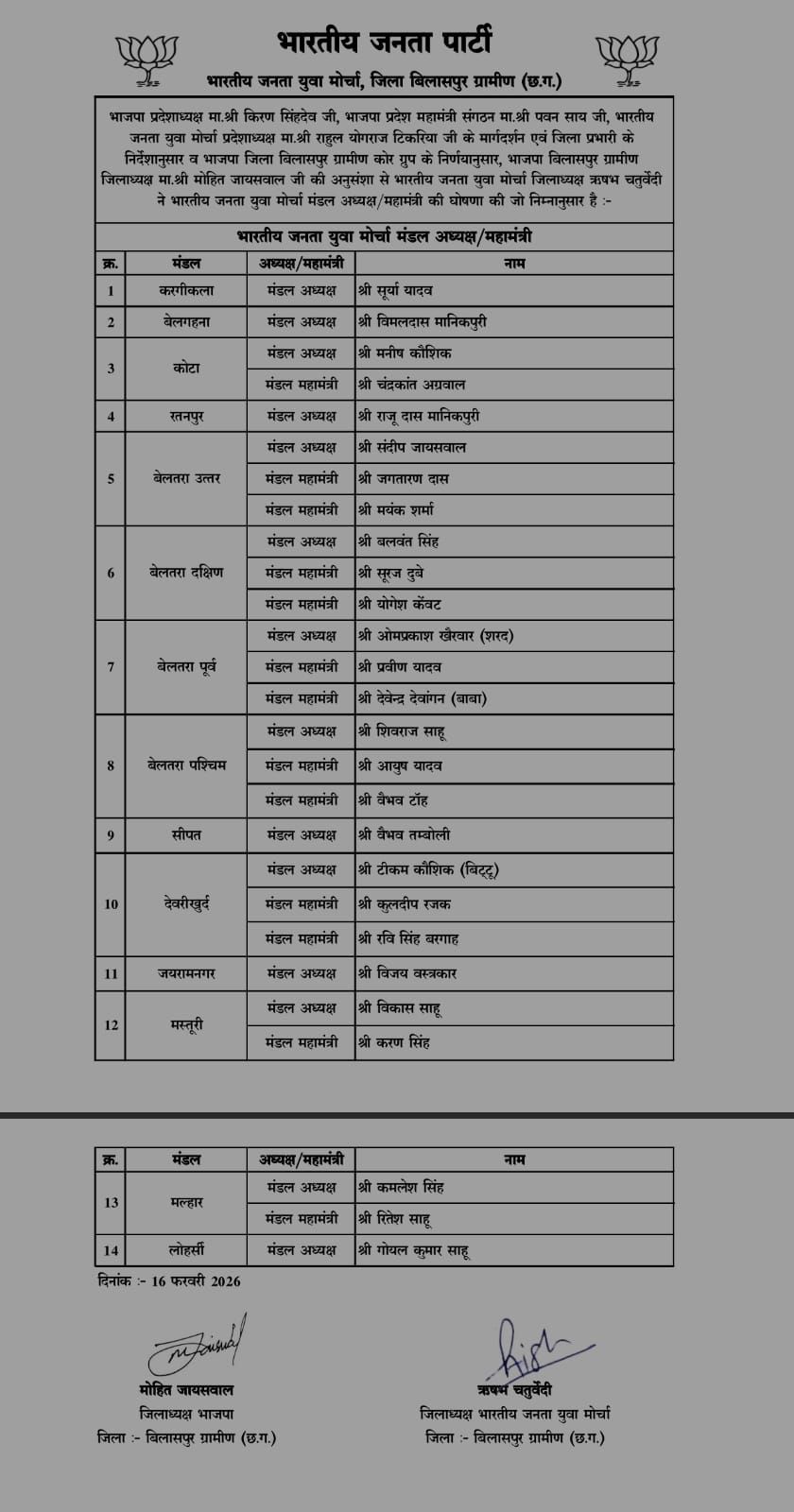 संगठन ने उनके अनुभव और सक्रियता को देखते हुए यह जिम्मेदारी सौंपी है।नवनियुक्त पदाधिकारियों ने पार्टी नेतृत्व का आभार जताते हुए संगठन की नीतियों को जन-जन तक पहुंचाने और युवाओं को जोड़ने का संकल्प व्यक्त किया है।