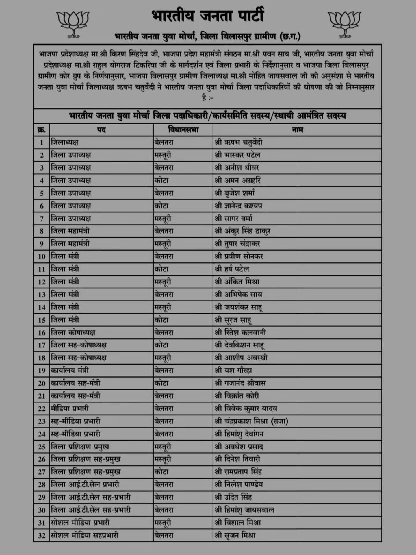 रतनपुर – धार्मिक नगरीय रतनपुर में बीजेपी के ग्रामीण कोर कमेंटी में युवा नेताओं को बड़ी जिम्मेदारी दी गई है। भाजपा प्रदेशाध्यक्ष किरण सिंहदेव , भाजपा प्रदेश महामंत्री संगठन पवन साय के मार्गदर्शन एवं भाजपा संभाग प्रभारी, संभाग सहप्रभारी एवं जिला प्रभारी के निर्देशानुसार व युवा मोर्चा के प्रदेश अध्यक्ष राहुल योगराज टिकरया की सहमति से भाजपा जिला बिलासपुर शहर कोर ग्रुप के निर्णयानुसार, भाजपा बिलासपुर ग्रामीण जिलाध्यक्ष मोहित जायसवाल की अनुसंशा से युवा मोर्चा जिलाध्यक्ष ऋषभ चतुर्वेदी ने युवा मोर्चा जिला पदाधिकारियों की घोषणा की है। जिसमे रतनपुर मंडल के लिए मोर्चा उपाध्यक्ष ज्ञानेंद्र कश्यप को जिम्मेदारी सौंपी गई है।